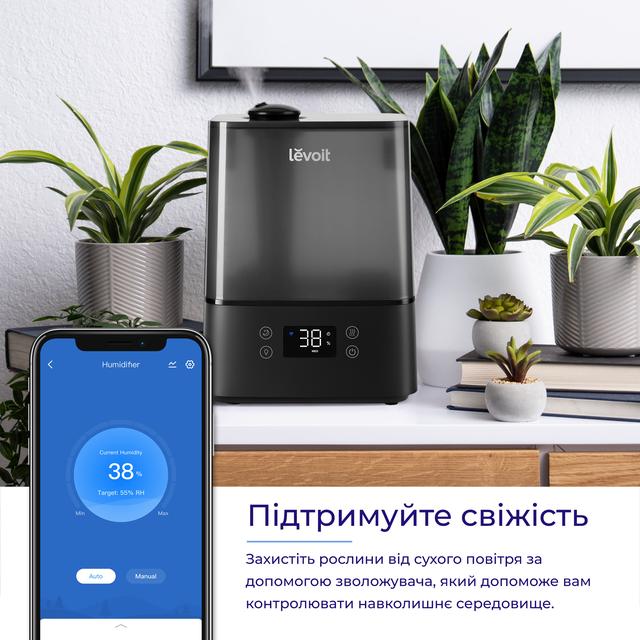 Під'єднайте розумний зволожувач до безплатного застосунка VeSync для дистанційного керування та під'єднайте його до сторонніх голосових помічників, як-от Alexa і Google Assistant, для керування без використання рук. Він працює зі стабільною мережею Wi-Fi 2,4 ГГц.