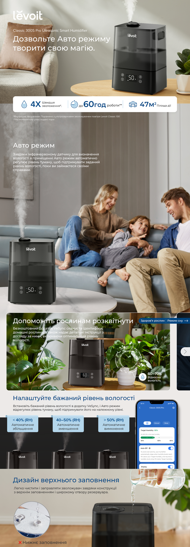 Перетворіть будь-яку кімнату на храм за допомогою ультразвукового розумного зволожувача Levoit VeSync Classic 300S Pro. Цей 6-літровий зволожувач забезпечує до 60 годин безперервного туману, має 4 режими рівня туману, ароматерапію й 7-колірний світлодіодний нічник для вашої зручності.