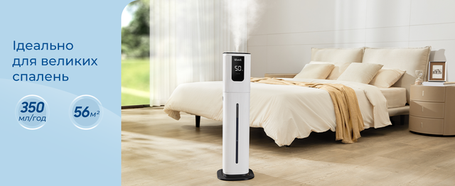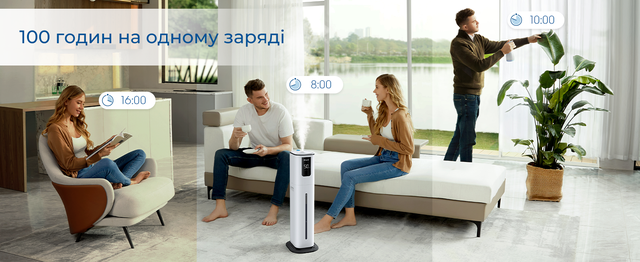 Безперервно зволожує приміщення площею 27-55 м2 упродовж 100 годин.