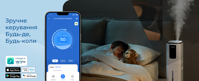 Керуйте налаштуваннями, створюйте графіки, переглядайте рівень вологості в реальному часі та багато іншого за допомогою безплатного застосунка VeSync.